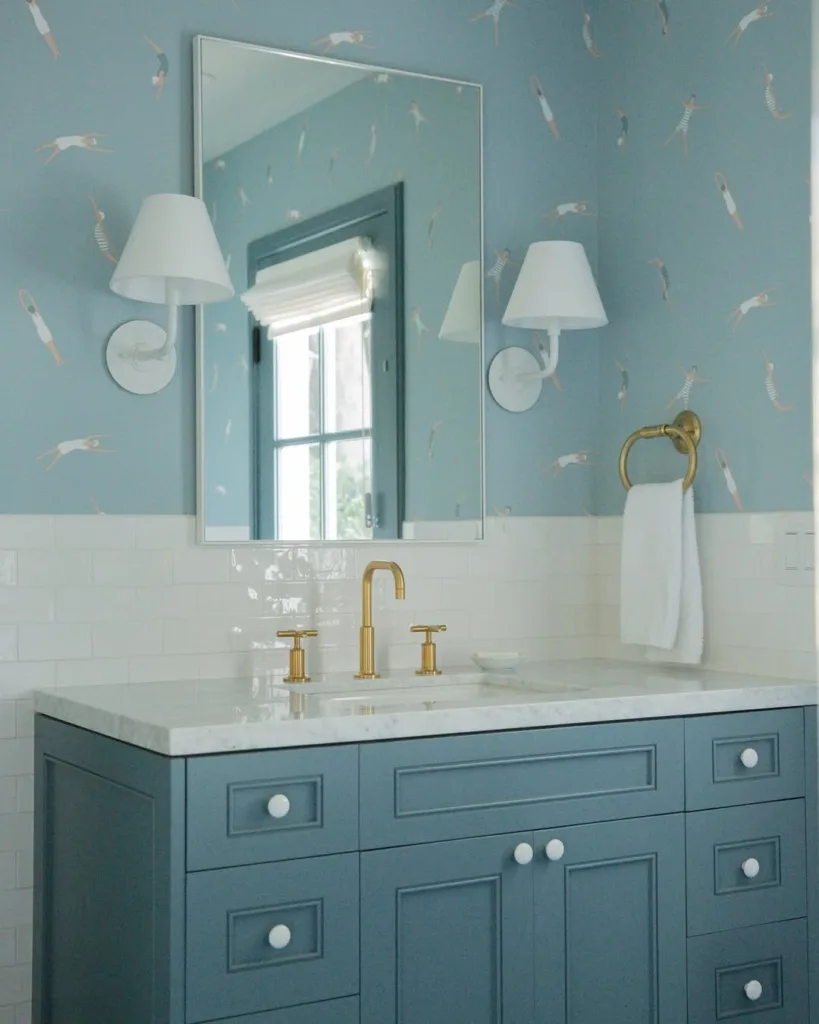 Golden accents, like the mirror and fixtures, add a refined touch without taking away the playfulness.