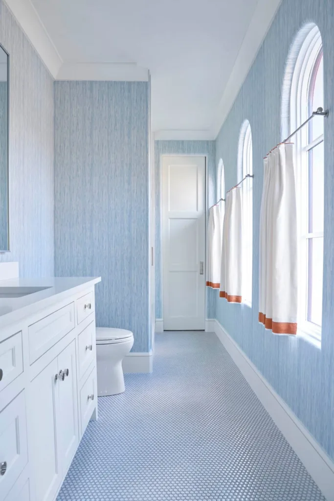 Soft blue wavy walls and penny-tiled floors make this bathroom calm yet playful. The subtle hues create a serene vibe without overwhelming the space.