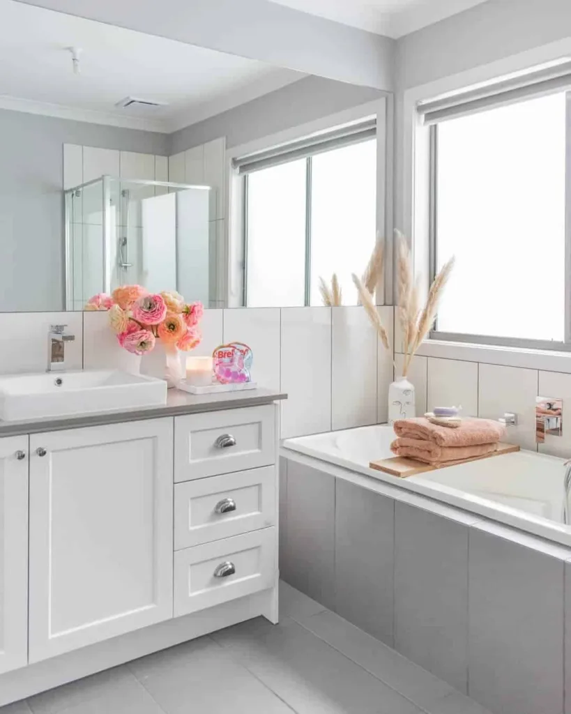 For a soft, fresh touch, try incorporating a plant or cute decor above the sink—it balances the look so effortlessly.