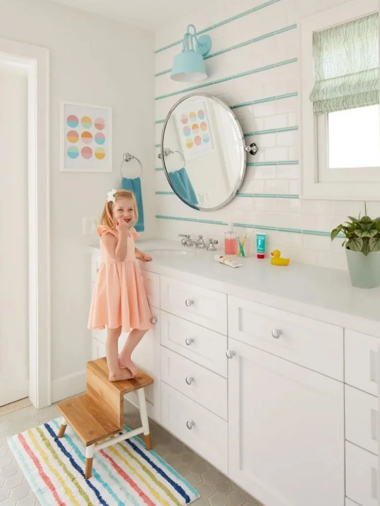 Adding simple accessories, like a mint stool, keeps the space functional for little ones while staying playful.