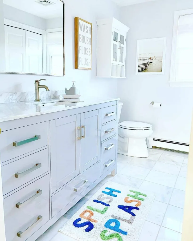 Adding bright towels or colorful bath toys can easily liven it up while keeping things kid-friendly.
