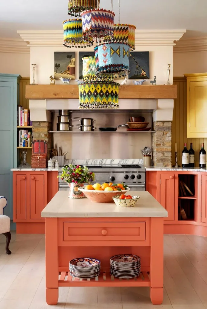This colorful setup completely brightens the kitchen! The orange base paired with fruit bowls is bold and playful while staying practical for everyday use.