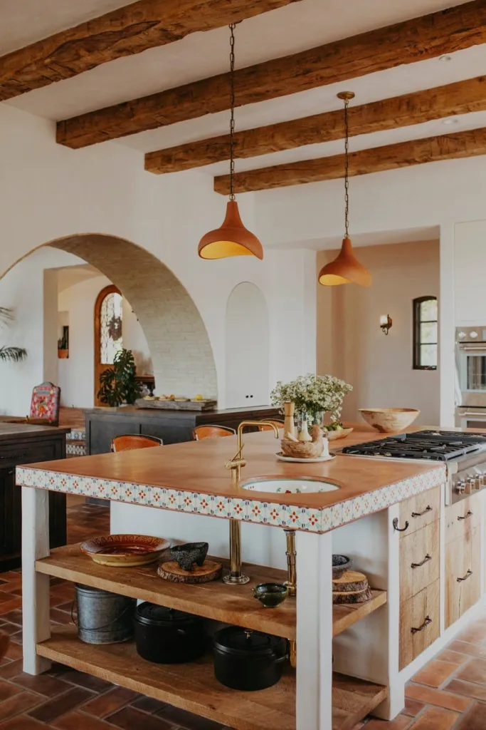 This look is all about understated charm. Brass pendant lights add elegance, and those wooden rolling pins emphasize a rustic, functional vibe.
