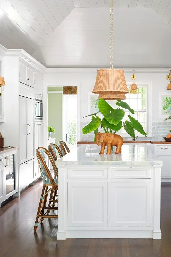 I’d add woven placemats or patterned textiles nearby to emphasize the tropical feel. This look is perfect for hosting guests or just brightening up your everyday kitchen.