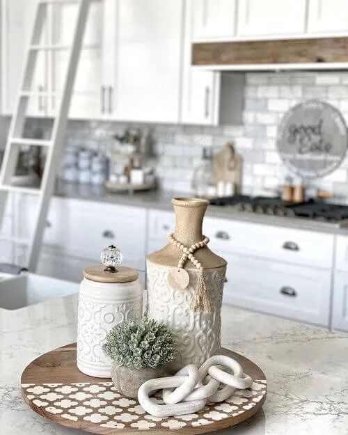 This setup screams farmhouse charm to me. A ceramic vase paired with a wooden tray creates a rustic look without trying too hard.