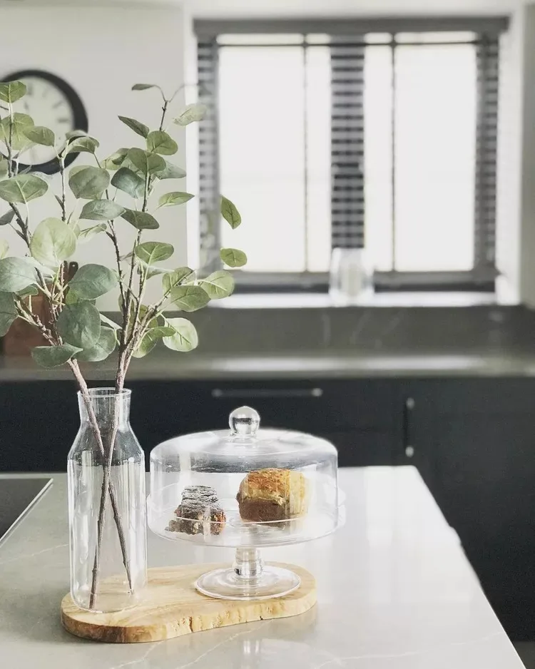 It’s hard to go wrong with clear glass decor. A simple vase with greenery adds height and elegance, while the glass cake dome makes baked goods look irresistible.