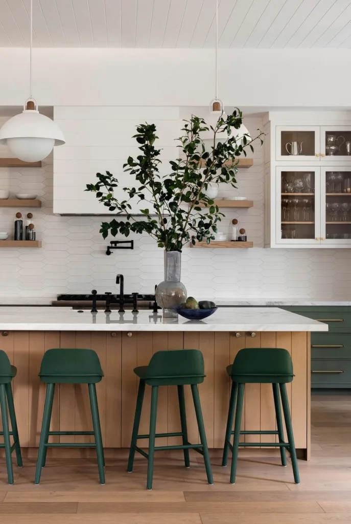 Pair it with simple bar stools and wood tones like in this kitchen—everything feels balanced and modern. Stick to one bold centerpiece to keep it elegant.