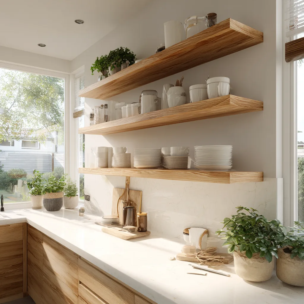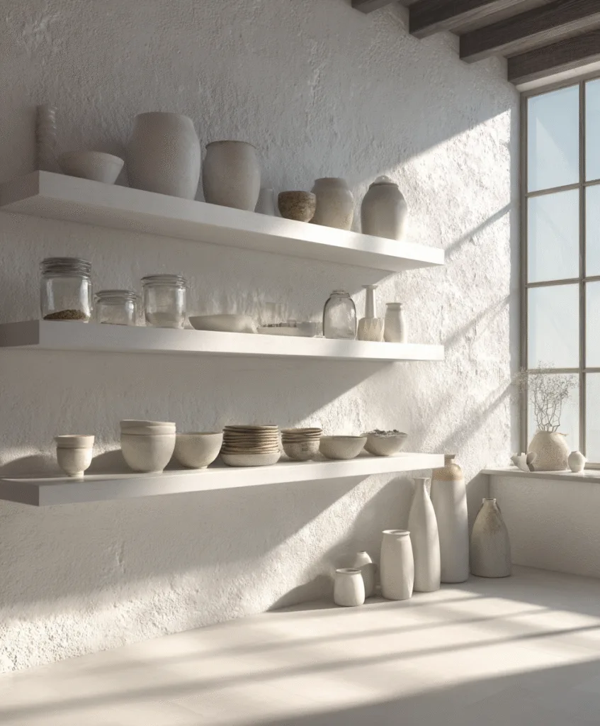 Sometimes, less really is more. If you’re aiming for that clean, fresh kitchen feel, all-white open shelves are your best friend.