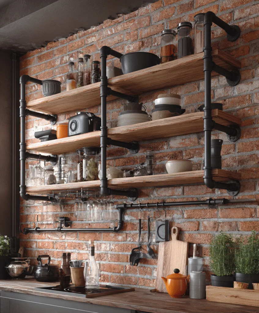 If you want a cool, slightly gritty look, pipe shelving totally brings it. Think coffee shop meets cozy kitchen.