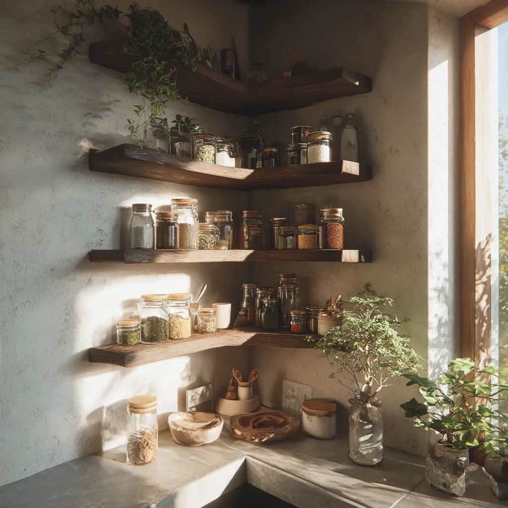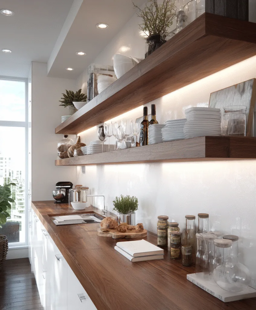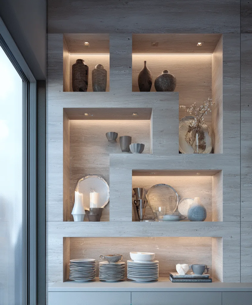 Styling Tip: Keep items simple—neutral dishes, glass jars, or plants—to let the shelf design shine.