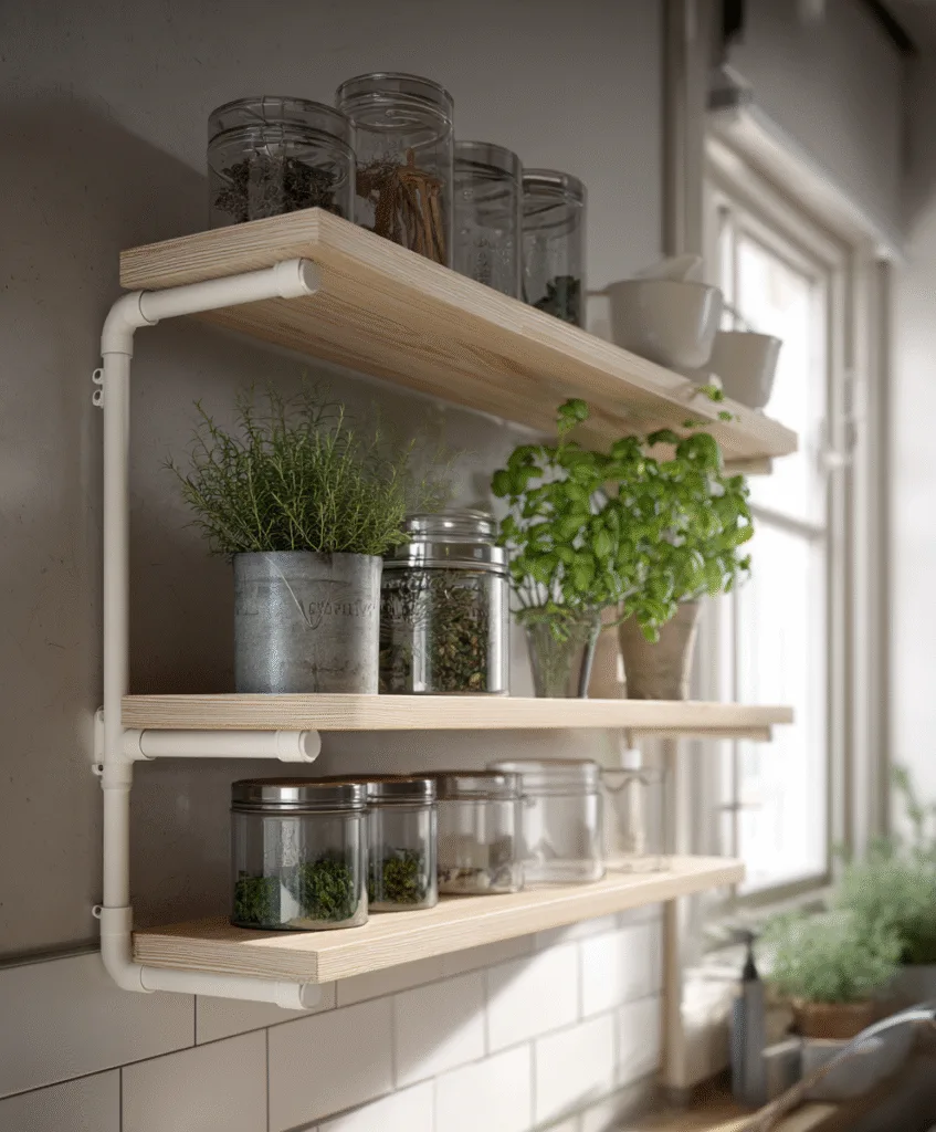 Bonus: Pipes double as towel or utensil bars if mounted low enough.