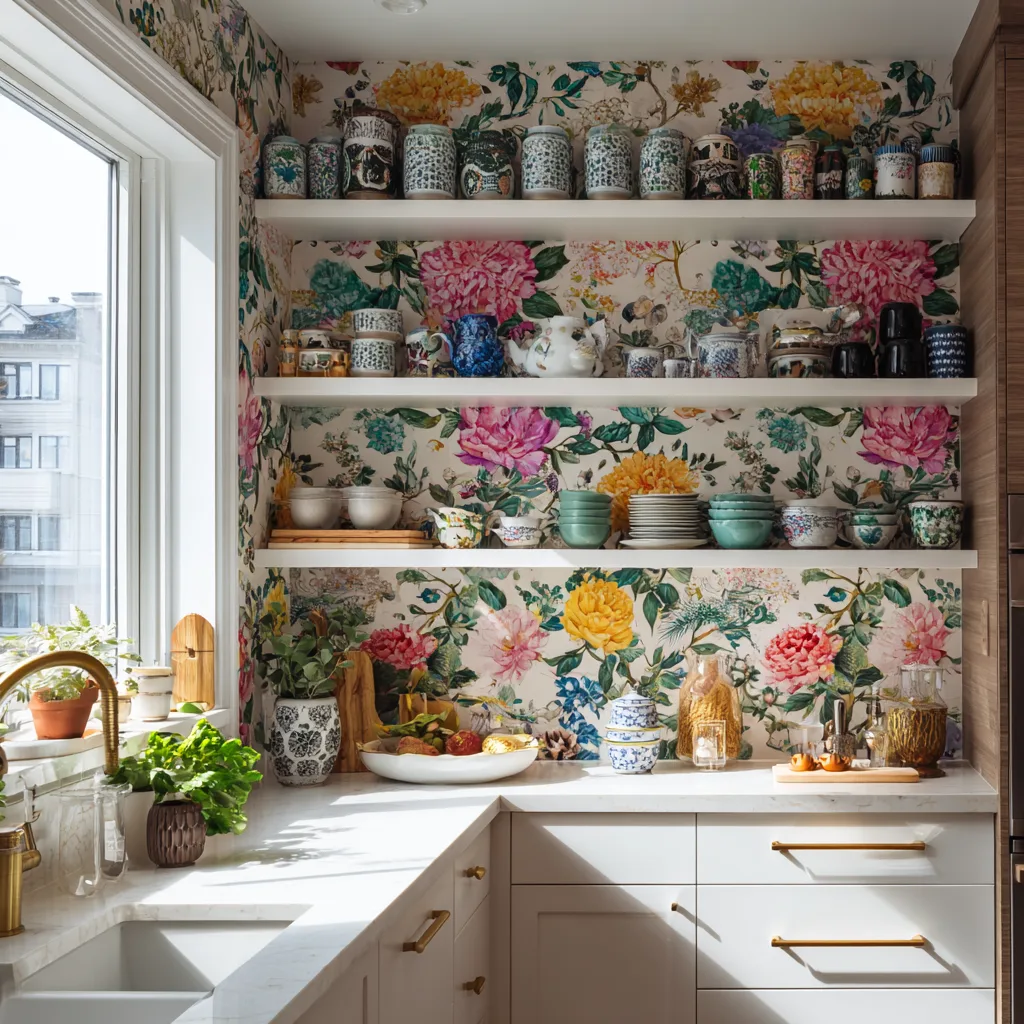 This one’s a design trick I swear by, open shelves backed by wallpaper make your walls pop without overwhelming the space.