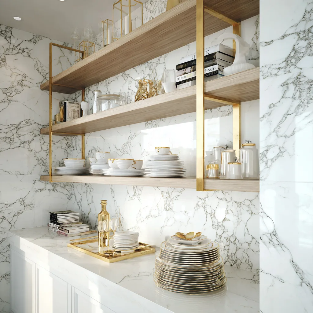 Marble + shelves? Chef’s kiss. This is for my luxe-loving friends who want something timeless yet elegant.
