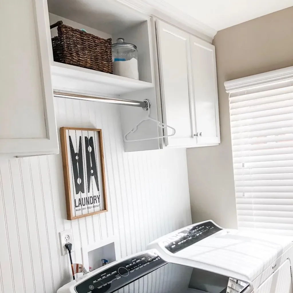 In this setup, upper cabinets offer smart storage, perfect for keeping essentials neatly tucked away. The hanging rod right above the washer and dryer is a brilliant addition, making it easy to air-dry delicate items without crowding your living spaces.