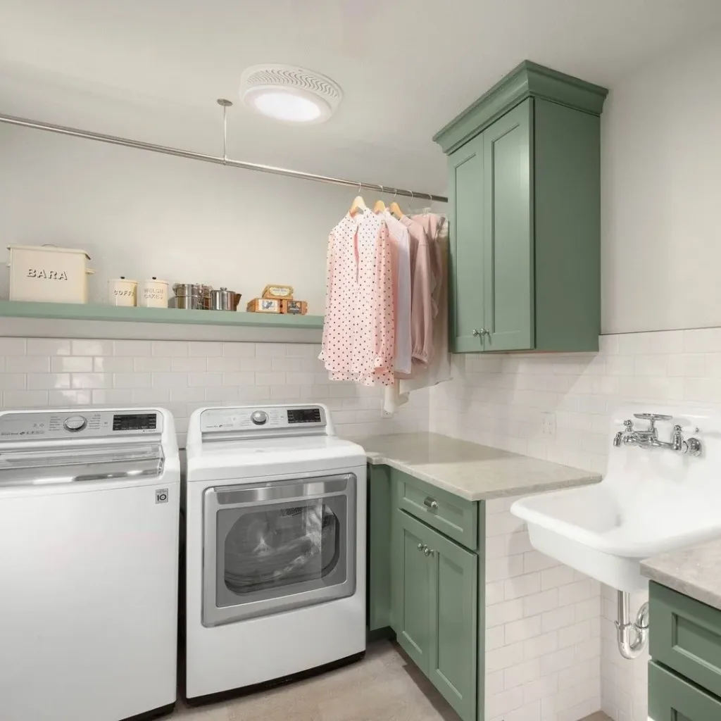 In this laundry room, blending the cabinet color with the appliance tones creates a unified and streamlined look. The muted, soft blue cabinets harmonize perfectly with the crisp white appliances, giving the space a fresh, polished feel.