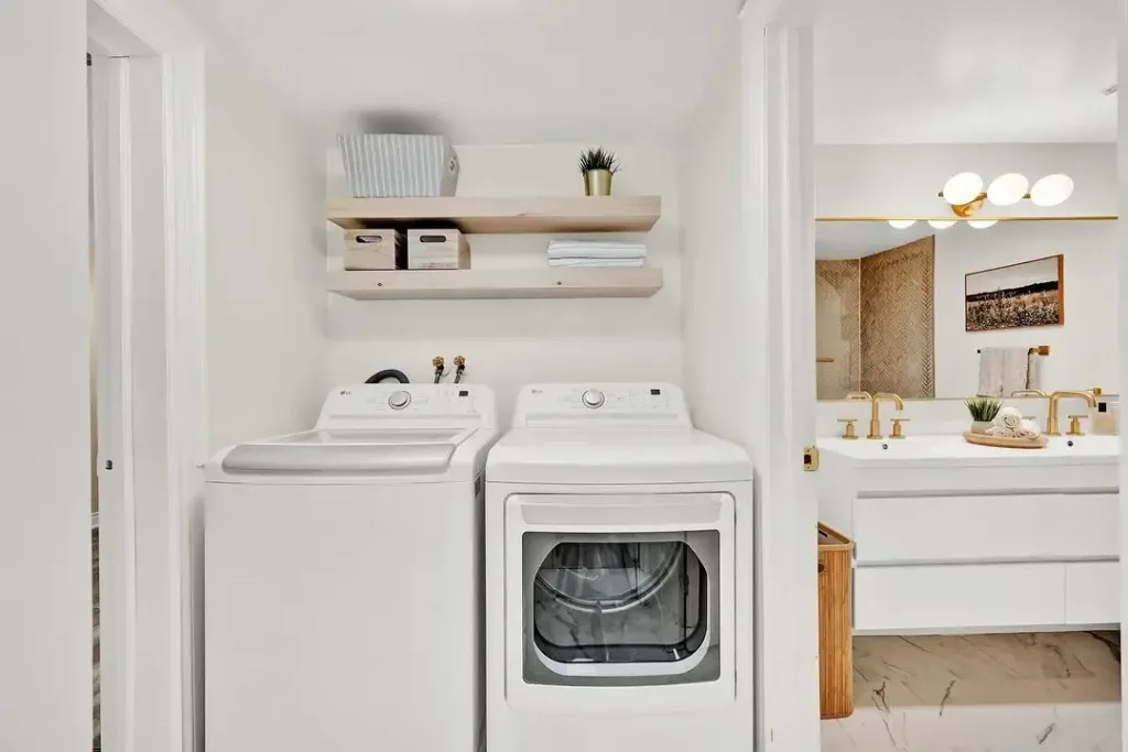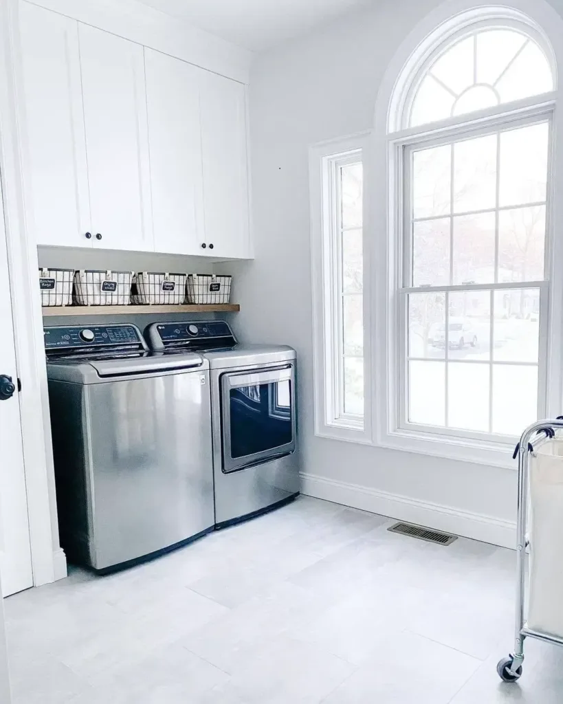 Keeping it simple and crisp, this white-themed laundry area offers a clean, minimalist look. With white shelving and appliances, it’s perfect for those who love a clutter-free aesthetic. Subtle decor items add just the right amount of personality.
