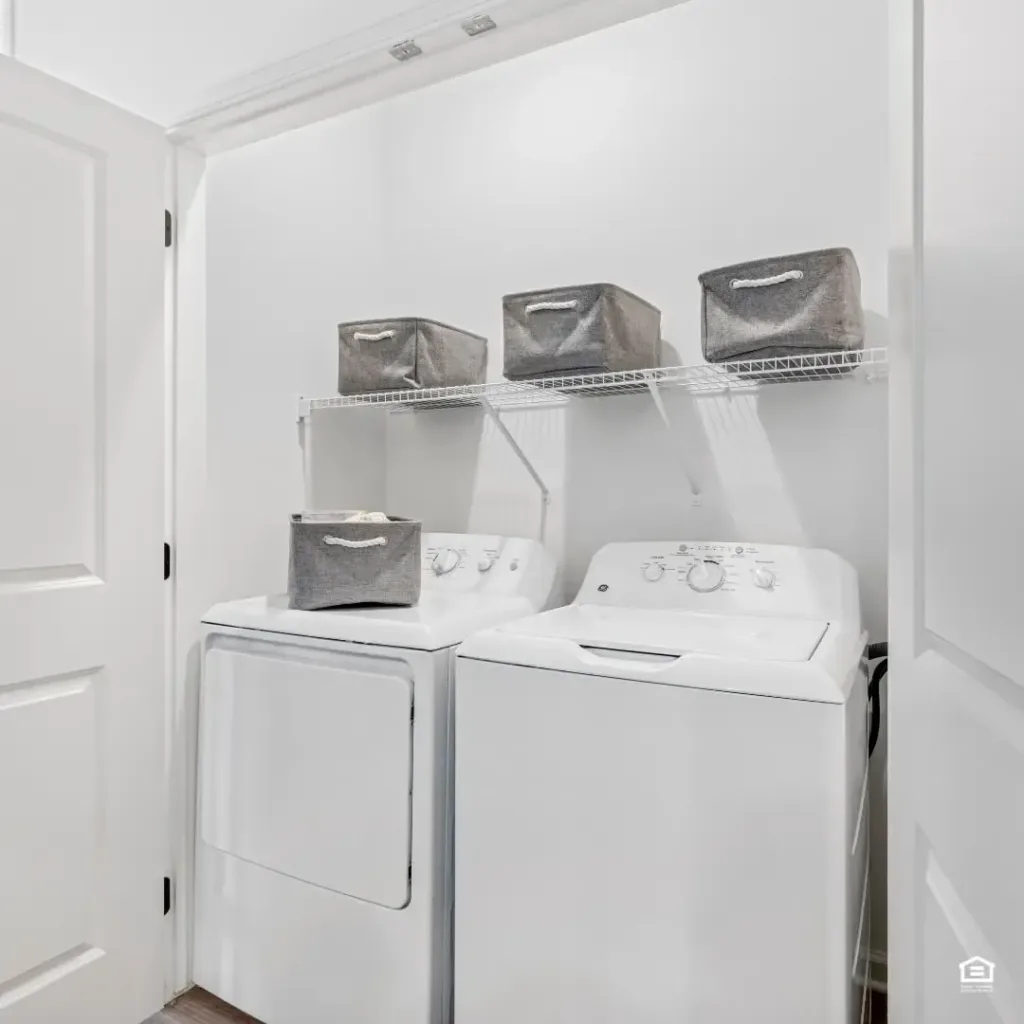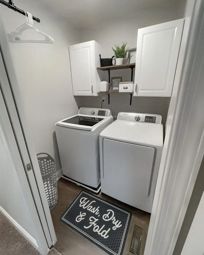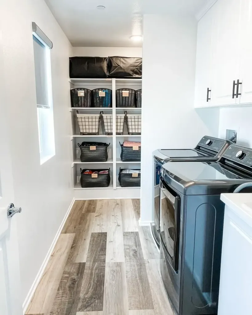 Ideal for smaller spaces, this laundry room maximizes every inch with smart storage options. Wall-mounted shelves and neatly placed baskets keep things organized without feeling cramped. It’s a compact yet efficient setup that makes the most of limited space.