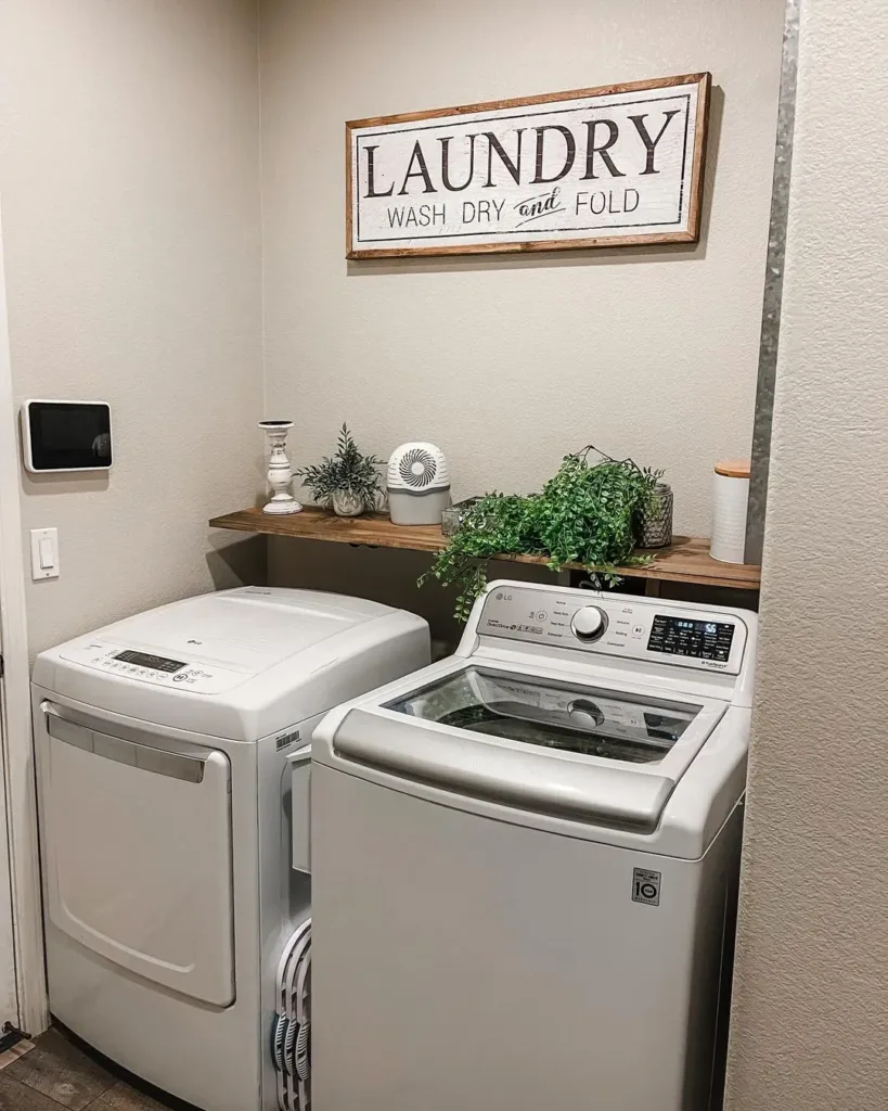 A rustic vibe fills this laundry room with its warm wood accents and touches of greenery. The wood shelves and decor make the space feel grounded and inviting, while the plants bring in a fresh, natural look.