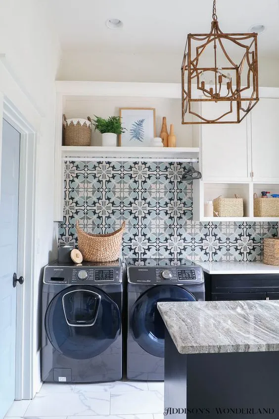 Transform your laundry area with eye-catching, modern tiles! This design uses patterned tiles as a focal point, making the space feel stylish and dynamic. Baskets and open shelves add practicality, rounding out this chic laundry room look.