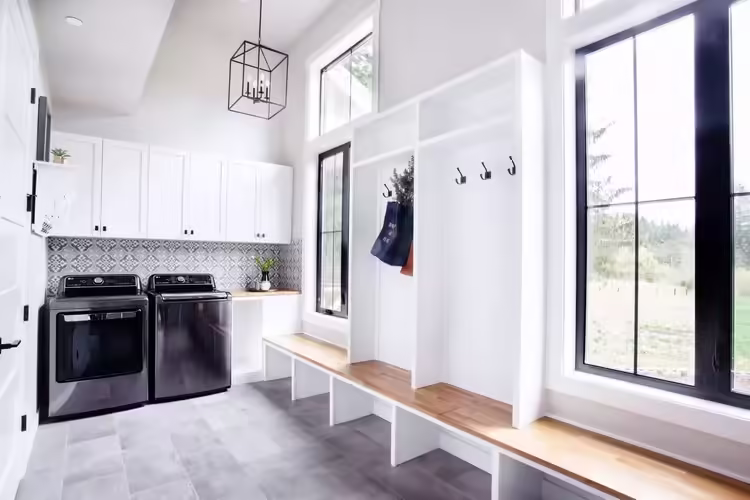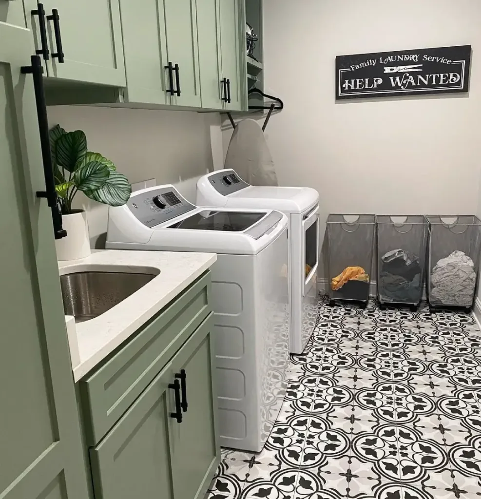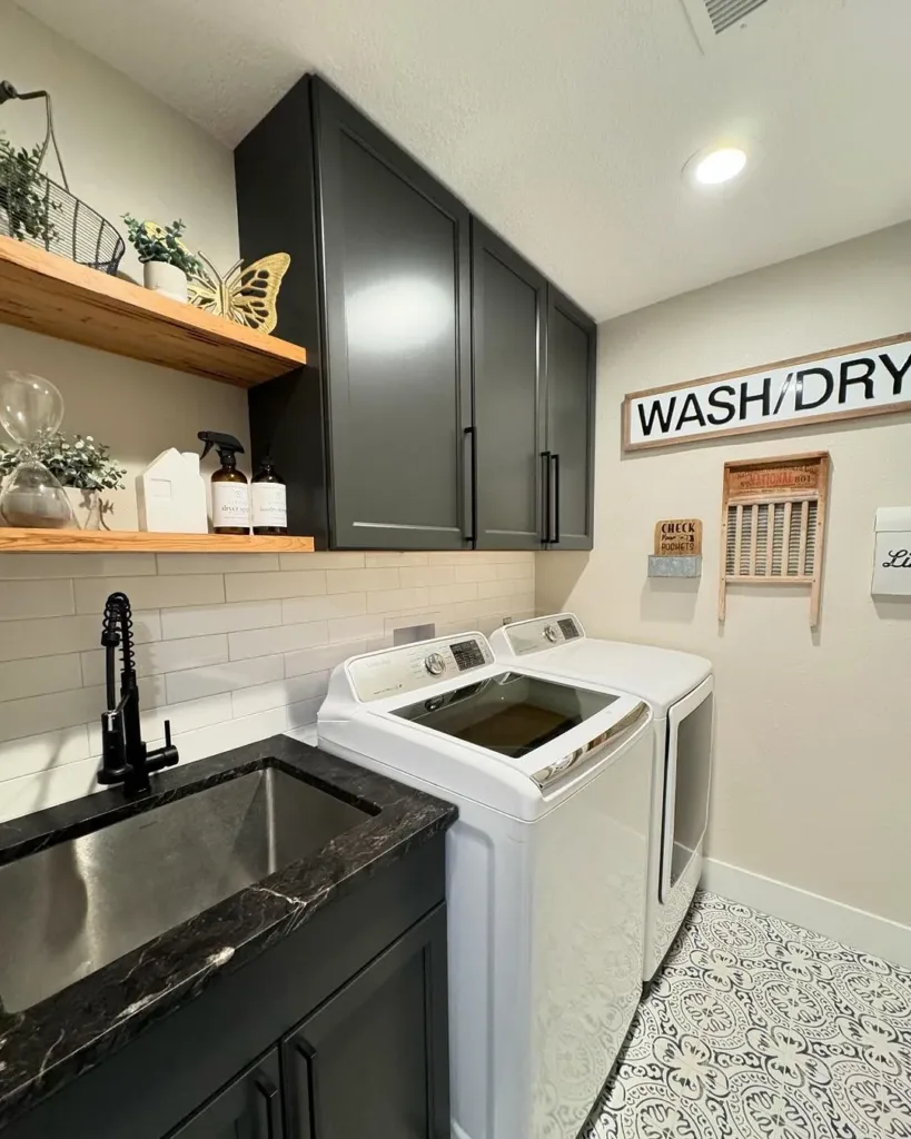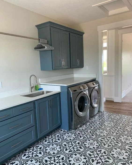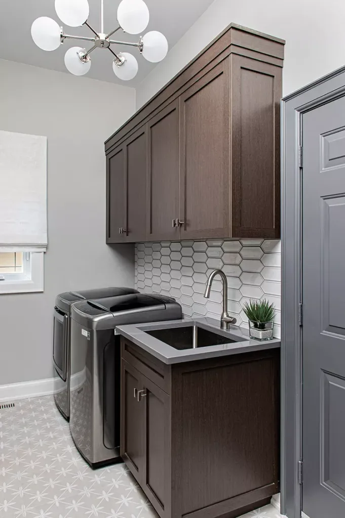 With dark cabinetry and a patterned floor, this laundry room strikes a bold, contemporary vibe. The contrast between light and dark elements makes it visually appealing, while the practical design ensures everything has its place. A chic, stylish choice for anyone looking to make a statement.