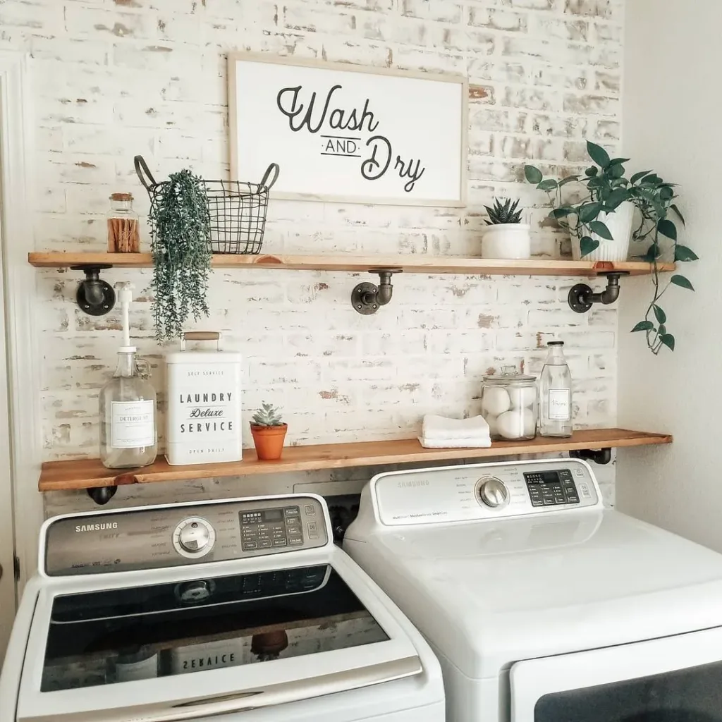 This industrial-inspired laundry room boasts a stylish brick wall, adding character and depth. The shelf displays practical items alongside decorative touches, blending functionality with a chic industrial aesthetic. It’s a standout look that’ll make laundry day feel a bit more exciting.