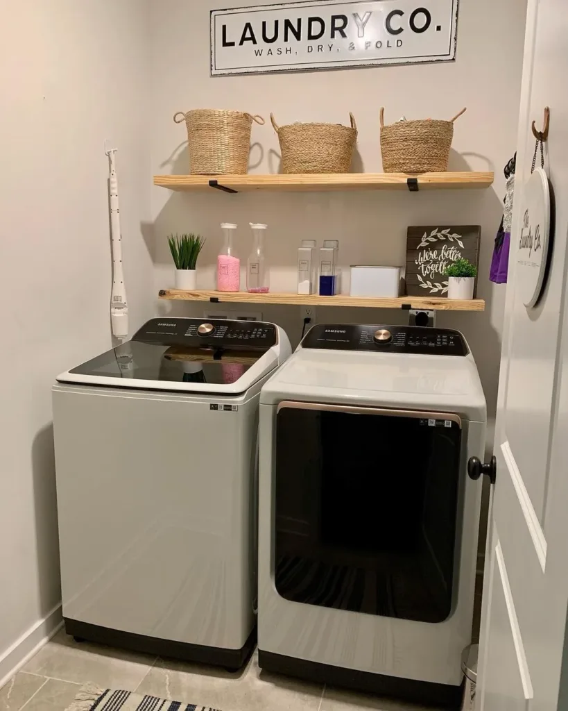 This laundry room keeps things tidy and straightforward with sleek wall-mounted shelves. A mix of baskets and containers keeps essentials within easy reach and adds a touch of warmth.
