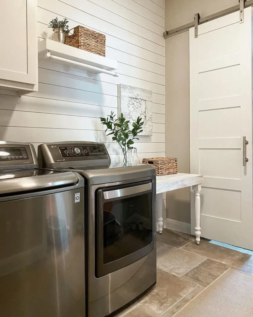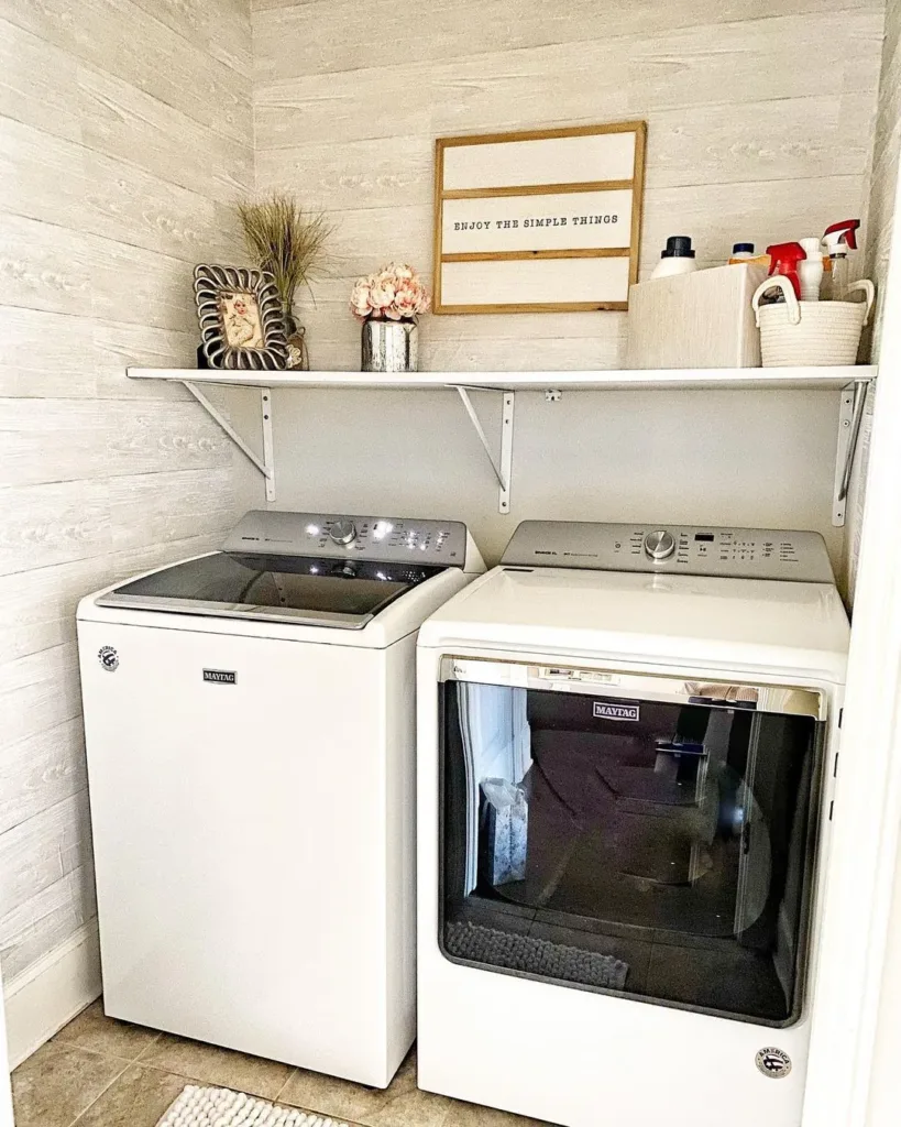 Shiplap walls bring a farmhouse-inspired charm to this laundry room. The decor is rustic yet cozy, with wooden accents and thoughtful details that make the space feel warm and welcoming. It’s a practical yet charming design that complements the top loader’s functionality.