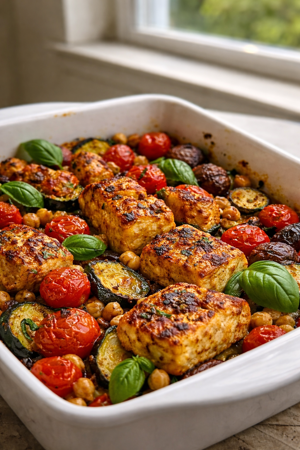 The golden cubes in the dish may look like chicken at first glance, but they are actually crispy roasted tofu, seasoned with Mediterranean herbs and spices. When roasted alongside juicy cherry tomatoes, tender zucchini, earthy mushrooms, and protein-rich chickpeas, the result is a flavorful vegan meal that feels both rustic and satisfying.