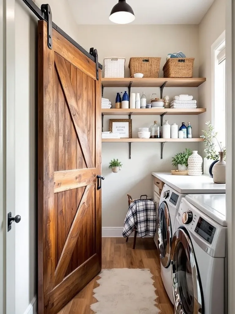 Add open shelving next to your washer for essentials. Comfortable, accessible, and stylish—that’s the barn door charm!