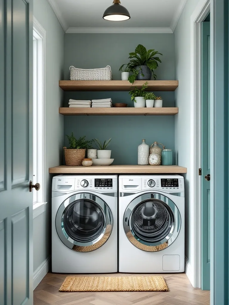You can even balance the look with small plants nearby. It’s such a simple way to make your laundry area more cheerful and personal!