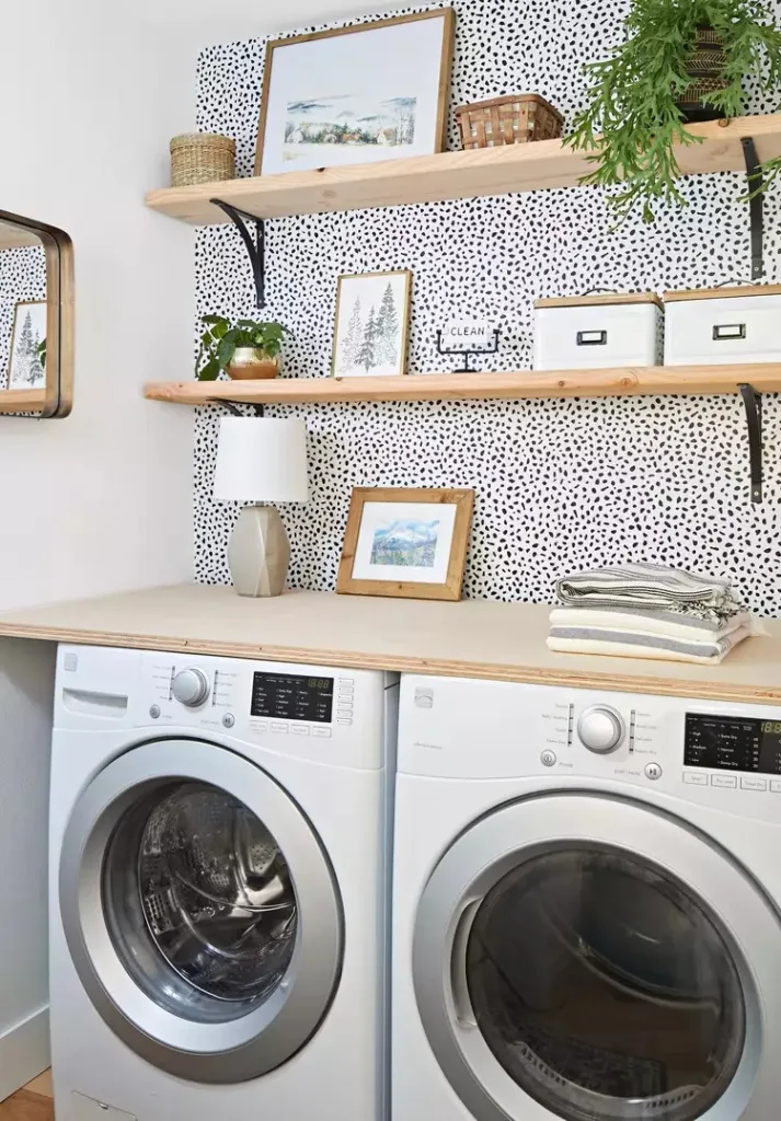 Multi-functional spaces are so practical, and this room nails it. Stacked machines, floating shelves, and a clean palette keep it inspiring.