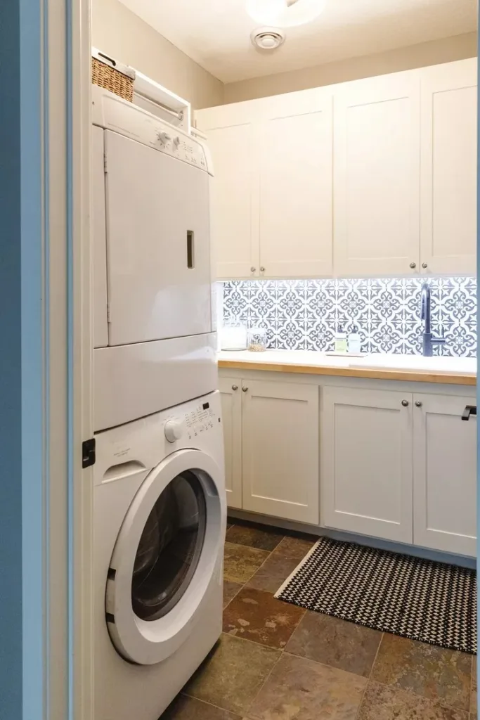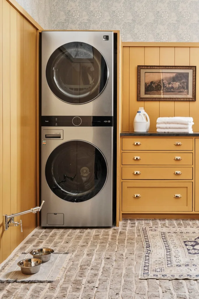 I adore the efficiency of stacked machines—look how much laundry this room can handle without taking up extra space. Perfect for families!