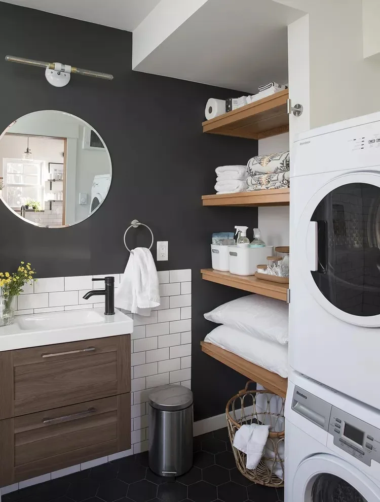 Wood elements add warmth, balancing the otherwise industrial feel of a washer-dryer. It’s cohesive and calming!