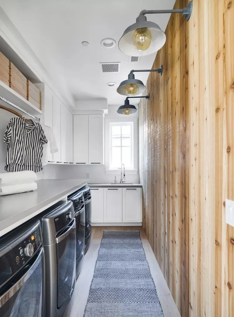 Rugs help soften the narrow design and make it feel cozier. If you’ve got the space, doubling up appliances is a laundry day win!