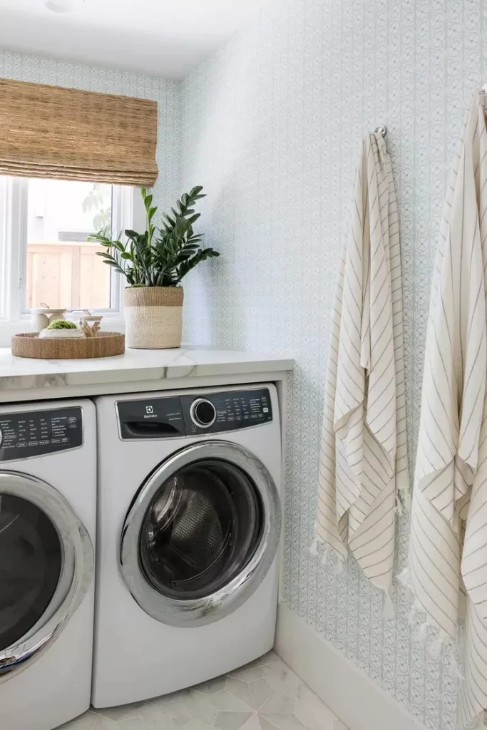 Coastal-inspired designs always bring a sense of calm. Here, the light wallpaper combined with the rattan blind creates a soothing vibe, making laundry feel less of a chore.