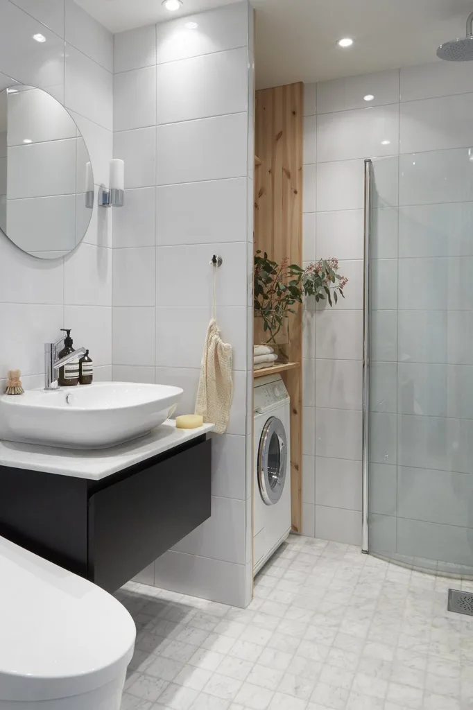 If your bathroom feels roomy enough, consider utilizing a discreet corner for your laundry—compact and stylish.