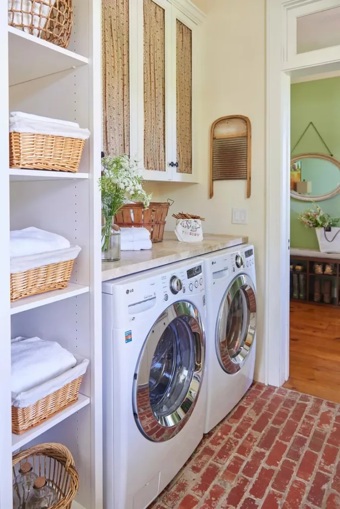 Converting a hallway into a laundry nook is pure genius! The brick flooring here gives it farmhouse character while keeping it resilient and easy to clean.