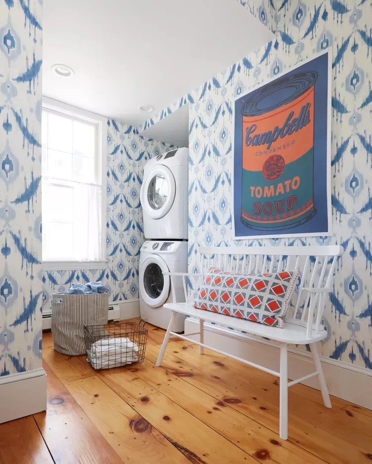 Add a geometric rug or bright wallpaper if you want to extend this cheerful vibe. Even during a dreaded laundry day, this setup makes it enjoyable.