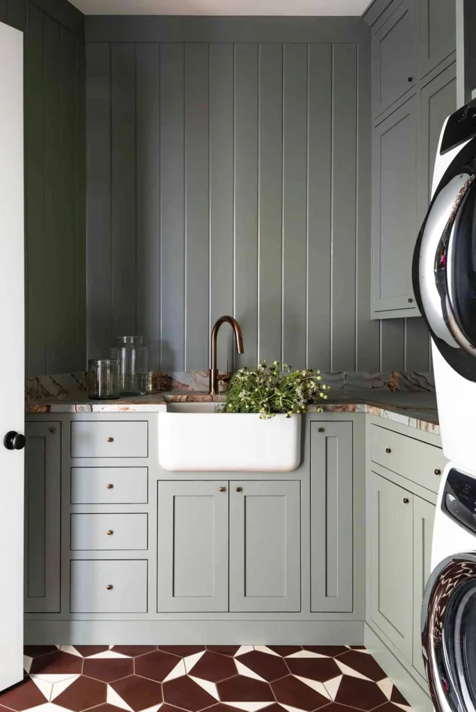 To keep things cohesive in your laundry room, stick to a palette and repeat tones across different elements. It’ll transform the space instantly.