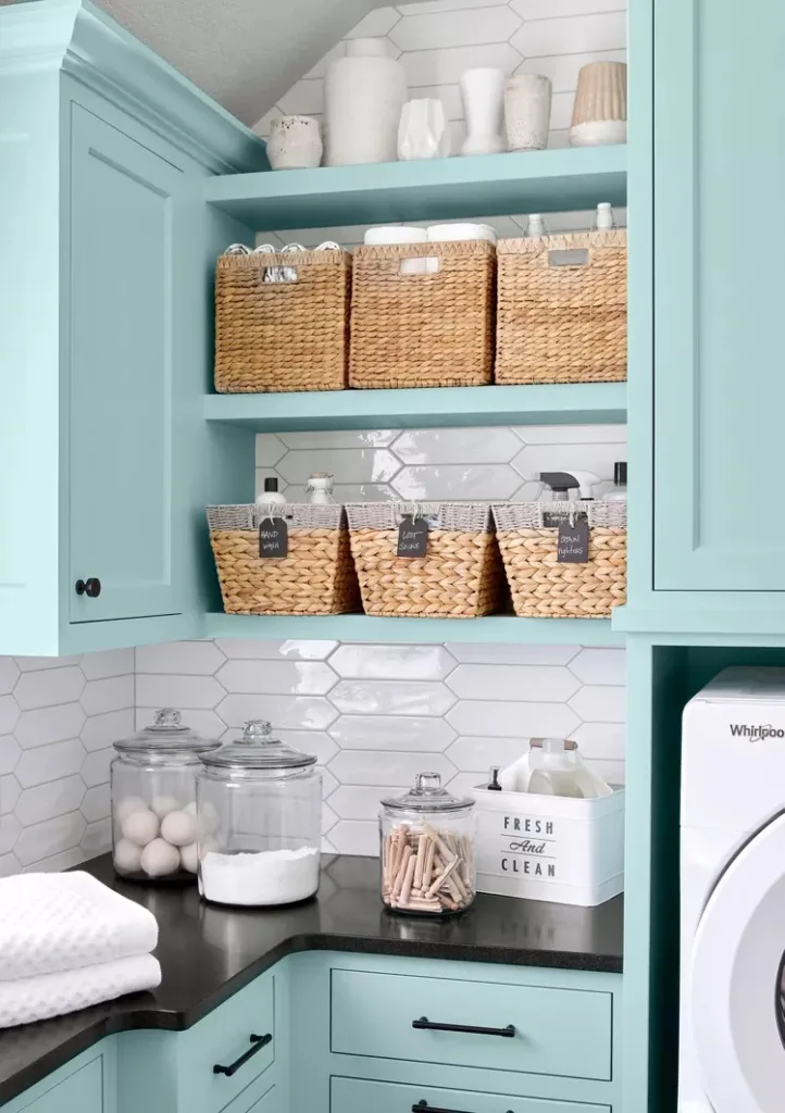 I say mix it up! I use open shelves for things like detergent pods and fabric softeners—they’re easy to grab and look cute in baskets. For everything else (hello, clutter!), I love closed cabinets. They keep the space from feeling chaotic.