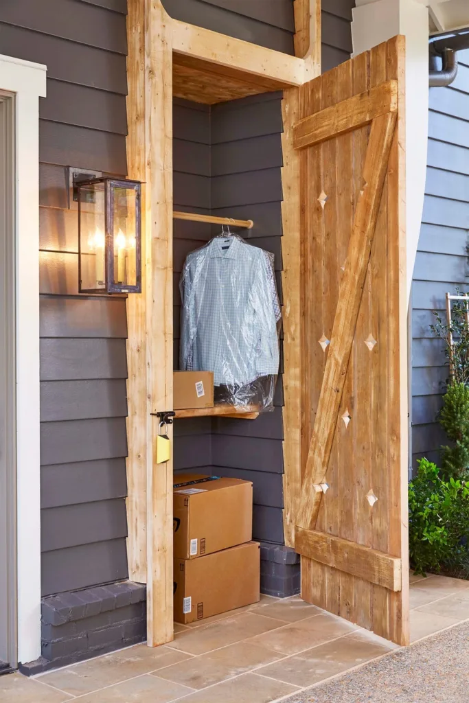 Installing a small dry-cleaning nook changes everything. This rustic spot, hidden behind a barn door, beautifully organizes clean clothes and packages.