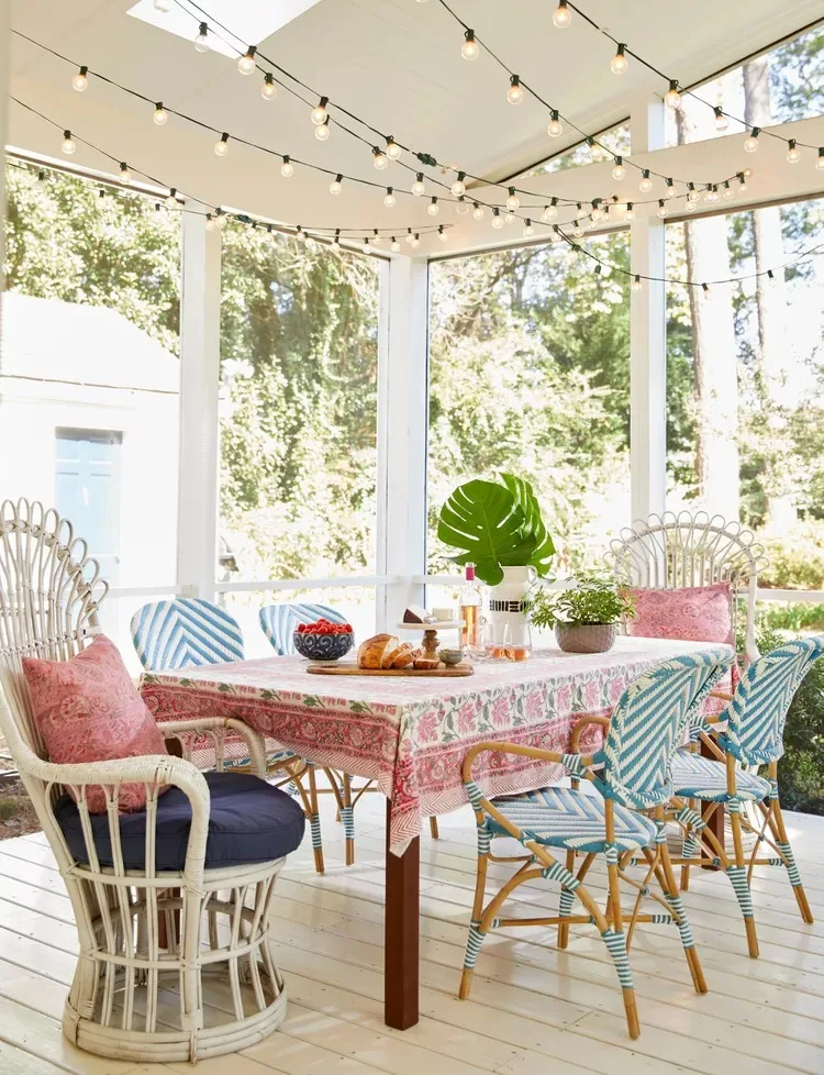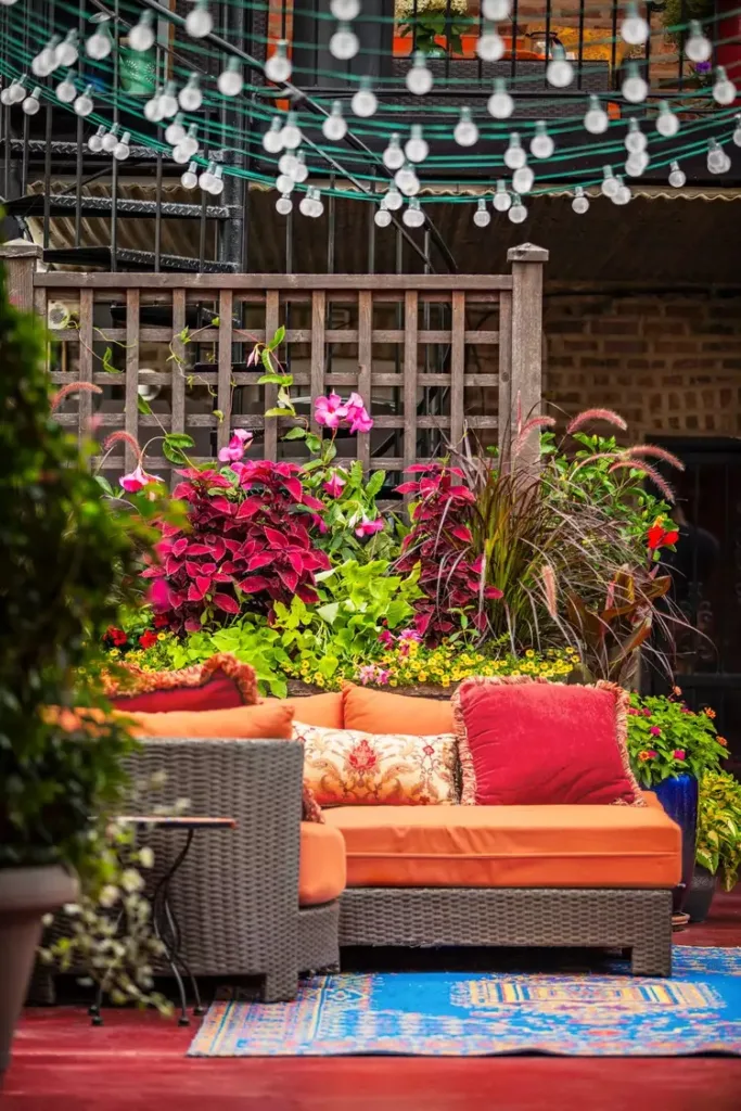 There’s so much charm in this setup! The string lights pull everything together, from the bold cushions to the colorful blooms.