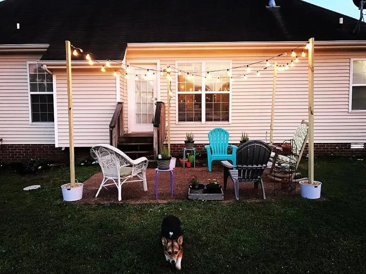 With two wooden posts and simple string lights, you can define your outdoor seating area with ease.