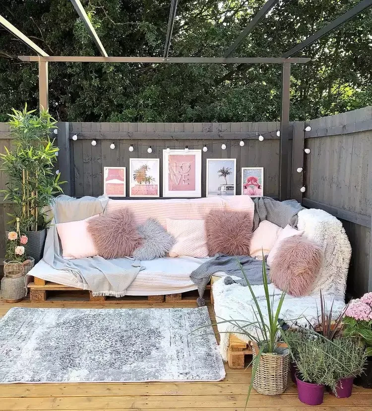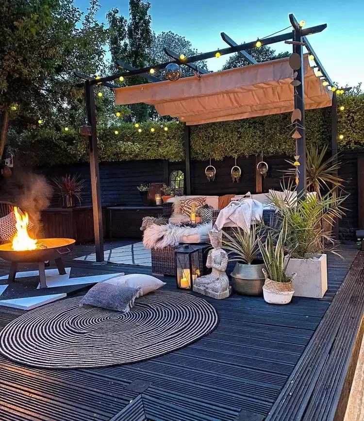 Make sure to choose weatherproof bulbs that’ll last you all season. Pair the lighting with boho-style cushions and textures—throw blankets are a must.