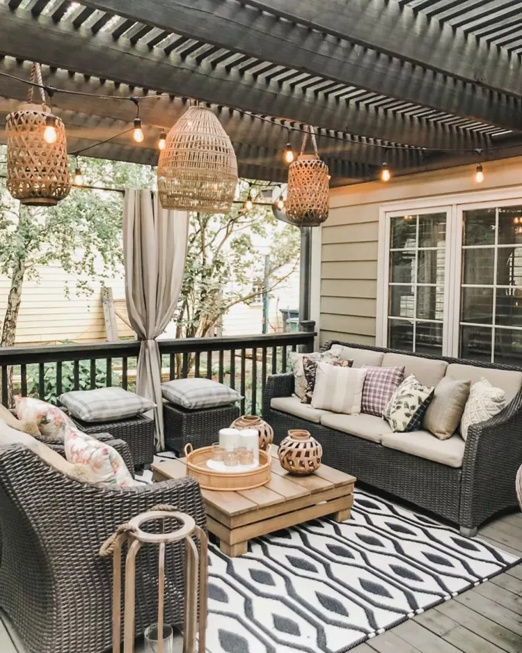 This space oozes charm. Mixing string lights with woven lanterns adds depth and warmth to the cozy patio.