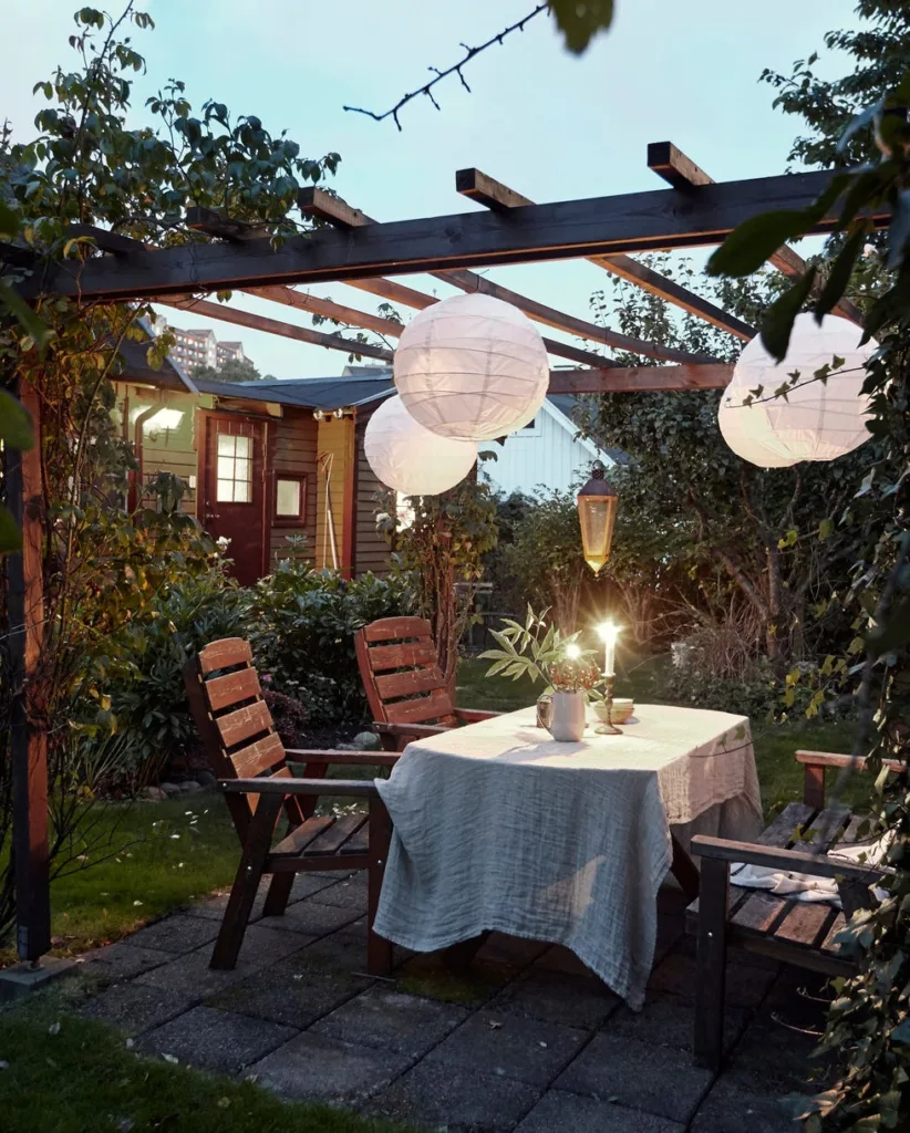 When I set up an outdoor dining area, I love keeping it simple yet magical. Adding soft lantern lights under a wooden pergola instantly transforms the mood.
