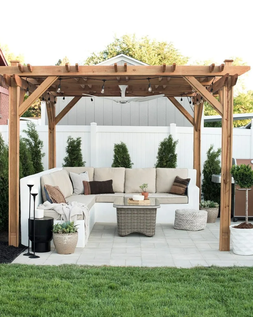 Don’t forget soft lighting—string lights or lanterns work great. I placed a few planters around my pergola to add greenery and found it really pulls the space together.