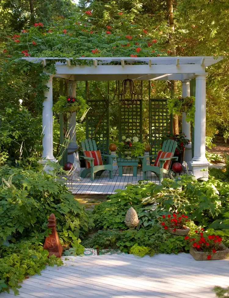 I once trained a climbing plant like wisteria to grow over wooden beams, and it looks magical. Tip: Use Adirondack chairs with colorful cushions for comfort and a fun pop of color.