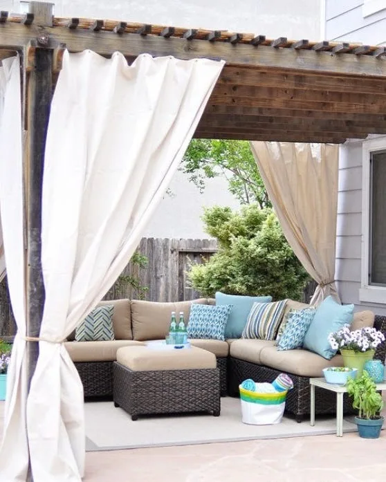 Secure the fabric with ties for windy days, and add a sectional for comfy seating. I’ve used outdoor-friendly cushions in soft tones to create coziness here.