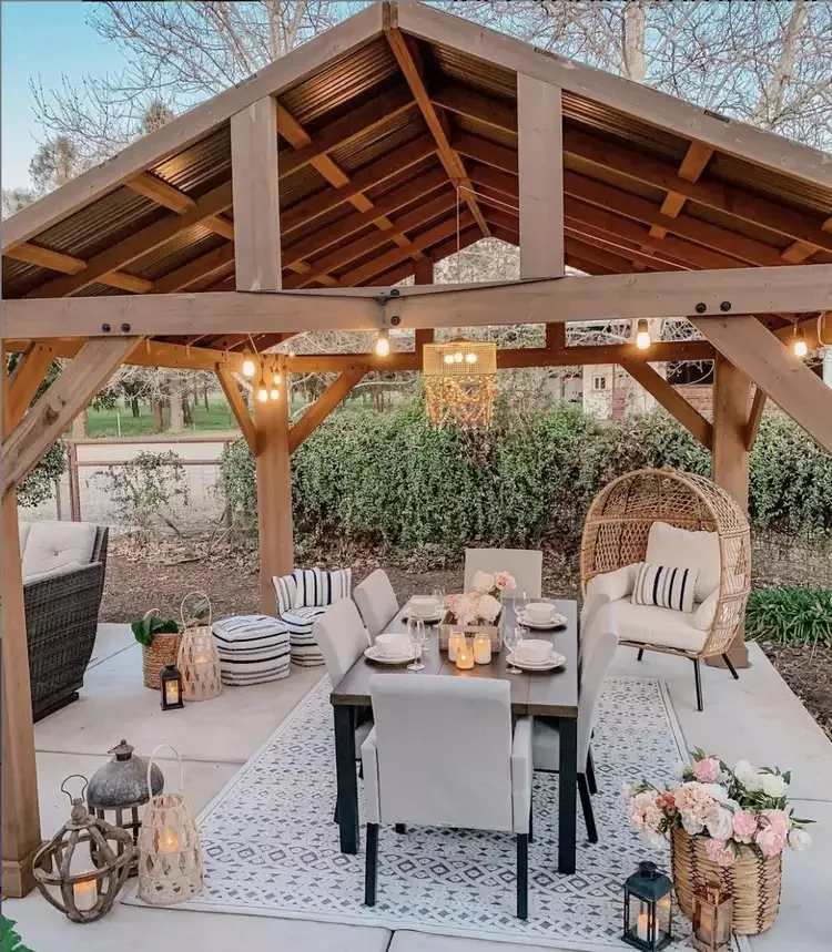I adore rustic wooden beams paired with soft seating like wicker chairs! Arrange your outdoor dining table where it catches natural light but stays shaded in your pergola.